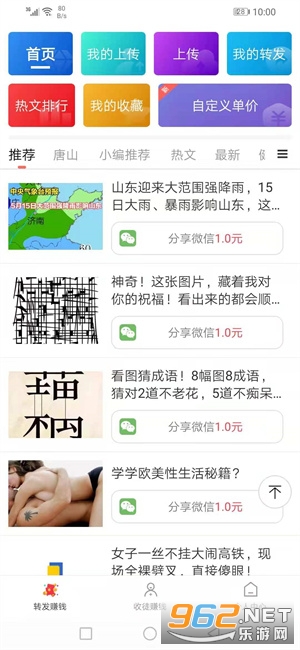 2、登录成功后,点击“转发赚钱”选择感兴趣的文章/视频转发到,被阅读即可获得相对应的转发酬劳