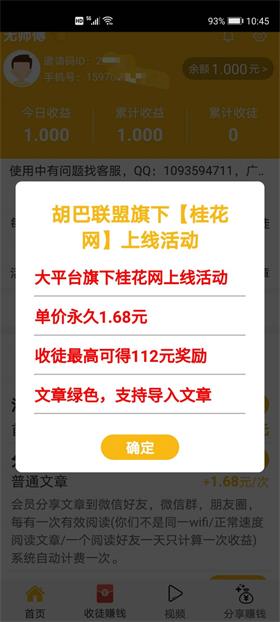 桂花网是一款转发文章赚钱的全新app,由胡巴联盟推出,超级高单价永久1.68元,上分快,可参与每日抽奖,超级给力,收徒奖励高,最高可得112元奖励。文章绿色,支持导入文章,更好吸引点击率。赚钱更快!
