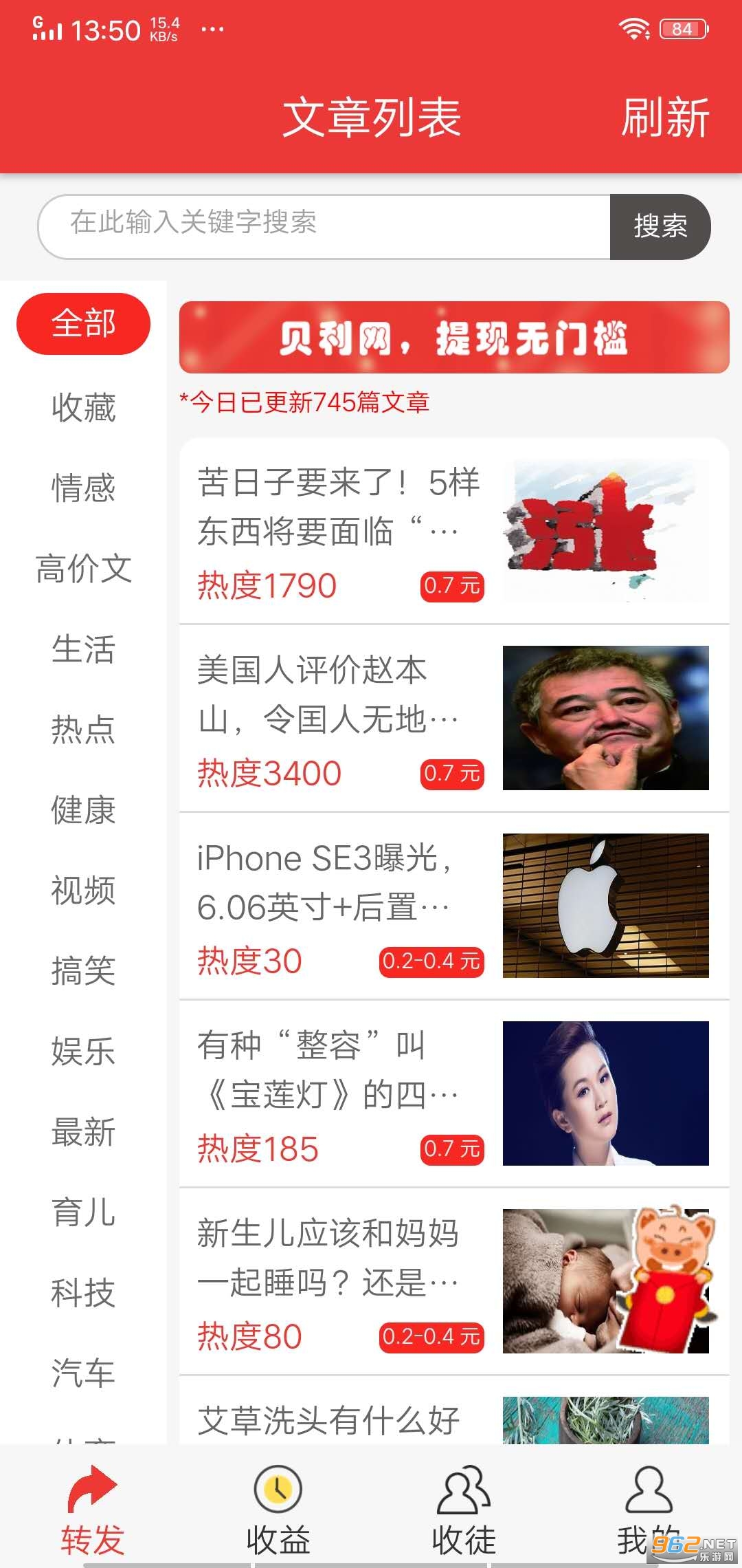 2、平台上更新包括美食、头条、健康等文章资讯,转发分享后,好友点击就挣钱;