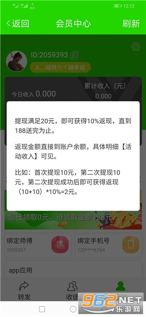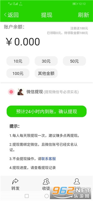 1、注册送188元,提现领返现,比如提现20元,可领2元,直到188元领完。