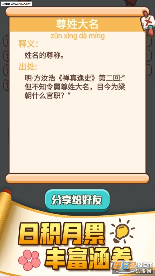 2、分享给好友还能获得提示,帮助你轻松的进行闯关,再也不怕成语字词太偏僻;