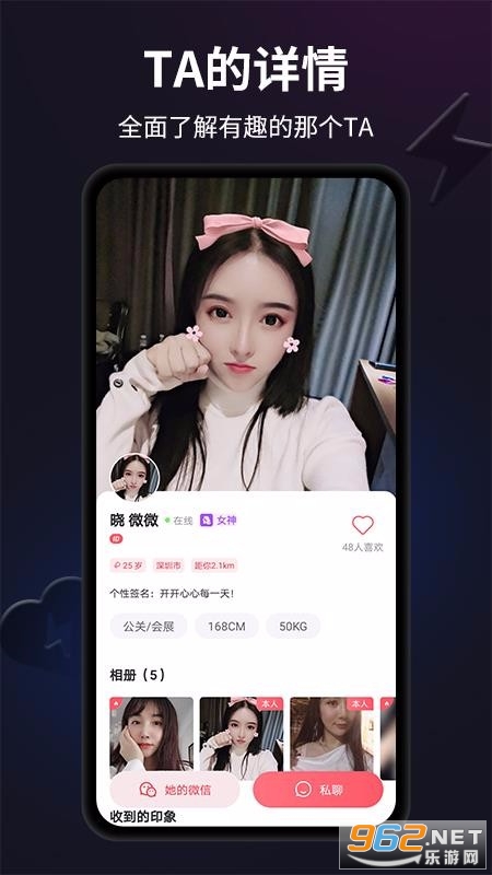 《闪月APP》是一款非常给力的美女约会交友平台,在这里,你可以聊天交友、匹配恋爱约会; 也可以快速匹配同城附近的TA,24小时随时随地约会交友聊天,而且门槛低,操作也方便,感兴趣的朋友还在等什么?欢迎来962下载试试吧