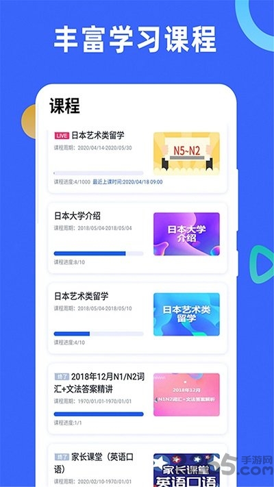 非常不错的线上学习软件,这里提供了海量优质的课程资源,为广大的在校学生、社会在职人员提供日语、韩语、英语等多种类课程,大多数的课程都是免费的,大家可以随时的进行学习,不需要付费观看,直播课程支持回放,错过了直播的时间是没有关系的,可以看回放视频。