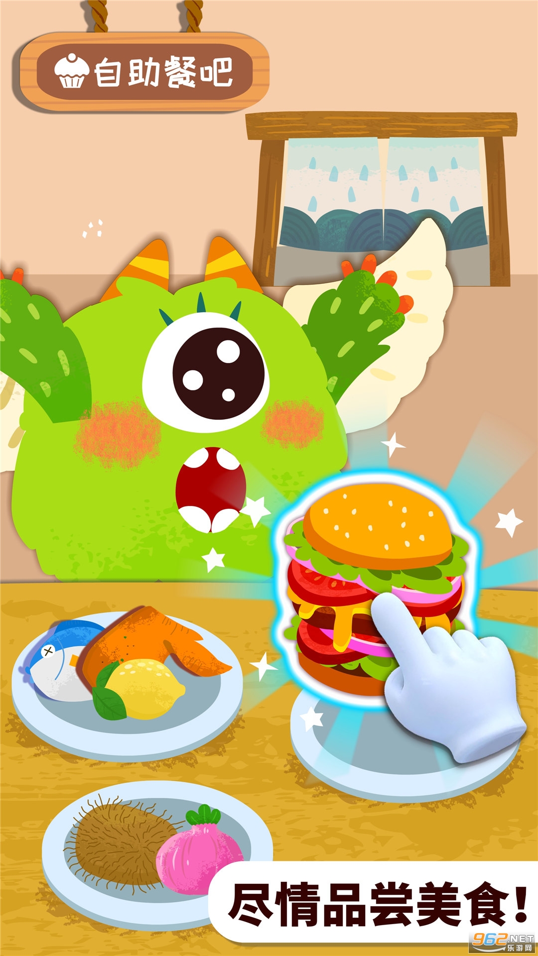 餐厅提供汉堡、小鱼、蘑菇、香蕉等美食,自助搭配,健康又美味!