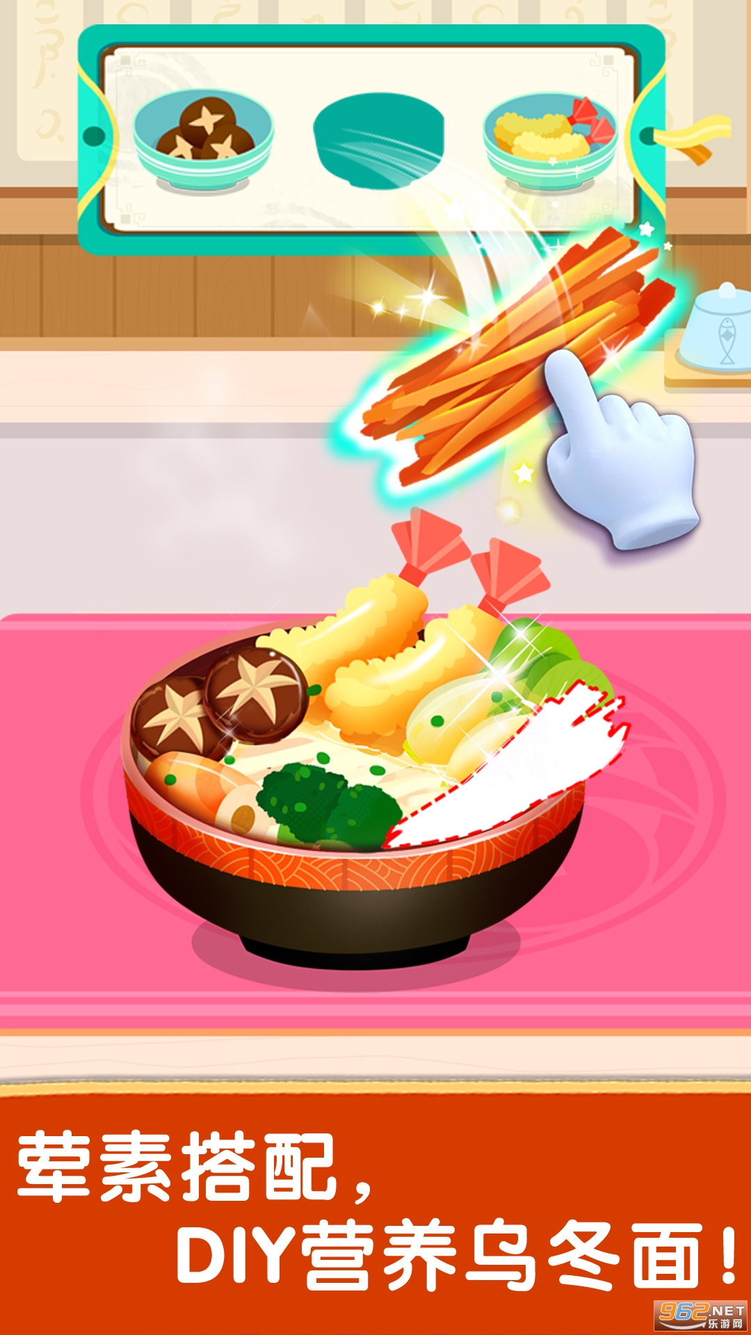 开始烹饪厨房美食——乌冬面啦!想要乌冬面更美味?用昆布煮出汤汁是美食秘诀哦。再加入柴鱼片组合、面条小分队,大火烹饪,美味的乌冬面新鲜出炉咯!