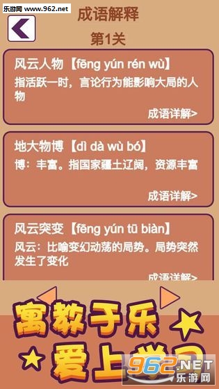 1.如果掌握的词汇量不够也没有关系,随着玩的游戏越多,你会学到更多的成语;