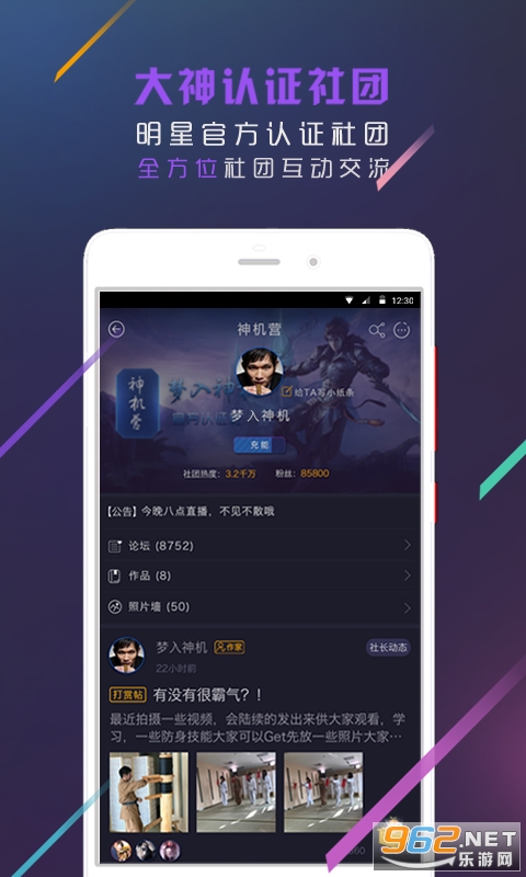 1、大神认证社团,明星官方认证社团,全方位社团互动交流。