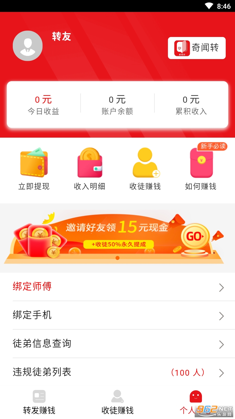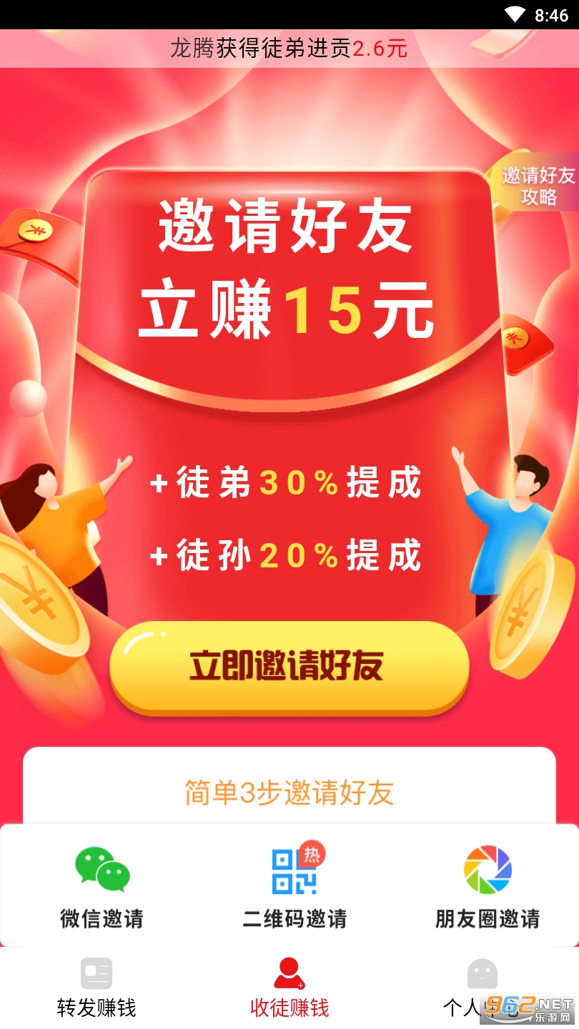 2、邀请收徒可获得最高15元/人的现金奖励,同时还有两级好友共计50%转发收益分成