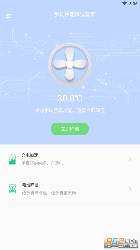 手机快速降温管家可以实时检测手机的温度情况,让你对手机的温度了如指掌。还有一键降温再也不用担心玩游戏、充电的时候手机烫手了。同时我们还有充电加速功能让你的手机充电更快捷。垃圾清理功能减少手机内存的占用让手机更快更流畅