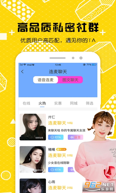 《走心聊聊》是一款非常给力的美女聊天交友平台,而且不需要任何费用,超多美女帅哥任你选择,并且它上边的交友信息全是历经严苛审批的,具备真实有效,用户能够安心,而且操作也方便,感兴趣的朋友欢迎来962下载试试吧!