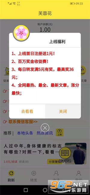 1、上线当天下载注册芙蓉花app就送1元,转发文章单价1元/阅读,支持上传文章