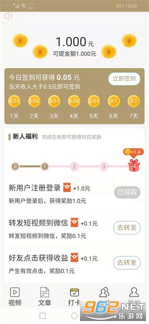 2、登录成功后,点击“视频”或者“文章”频道转发任意文章或者视频到,被阅读后就有现金奖励