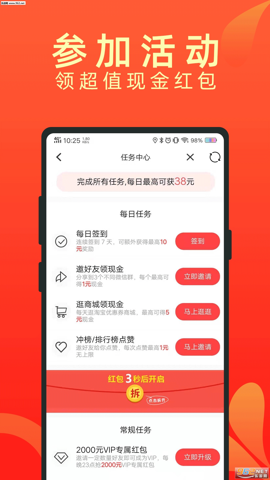 一款专业的掌上做任务赚钱平台,在这里用户只需要按照平台的要求完成每天任务即可,还能随机获得不错的红包奖励,让你轻松赚钱,感兴趣的老哥快来962下载吧!