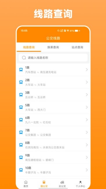 1、线路查询功能,用户可随时查询需要的公交线路,获取详细的线路信息和站点列表。