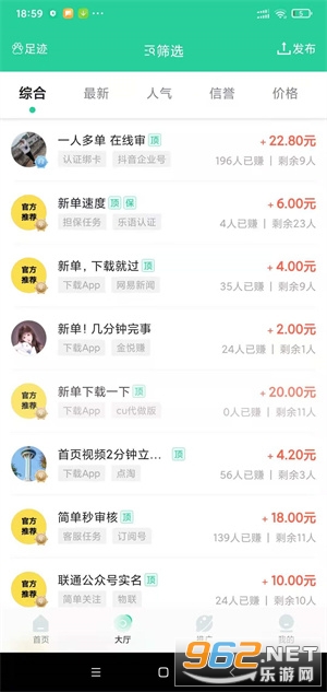 2、登录成功后,在“首页”或“大厅”任选一个任务后点击“立即报名”,根据任务步骤完成即可