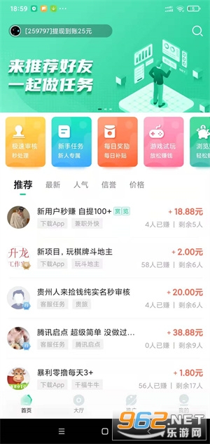 2、通过完成平台内的悬赏任务即可轻松赚零花,任务单价从0.1元到100元不等,每日完成一定数量的任务还有额外现金奖励