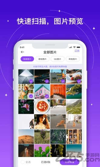 手机相册照片具备强大的功能和高效的数据恢复成功率。无需注册,极速扫描,即刻恢复!免root!无论是您平常使用手机相机拍的照片,还是手机截图,或是朋友圈,QQ等APP的使用图片。通过一键扫描,快速检测,深度扫描迅速还原丢失或删除的数据,轻松恢复!