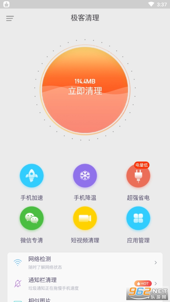 它具备垃圾清理、内存加速、CPU降温等功能,能够清理设备中垃圾文件,还原系统空间,缓解设备内存空间不足、卡顿等问题,优化系统CPU占用,延长电池寿命。除此之外应用管理、通知栏清理、相似图片清理、专清、短视频清理、设备信息实时查询等特色功能,也让您清楚地了解手机当前存储空间余量、内存消耗、CPU占用等信息,并有针对性的进行清理、加速等操作,让手机性能更佳。