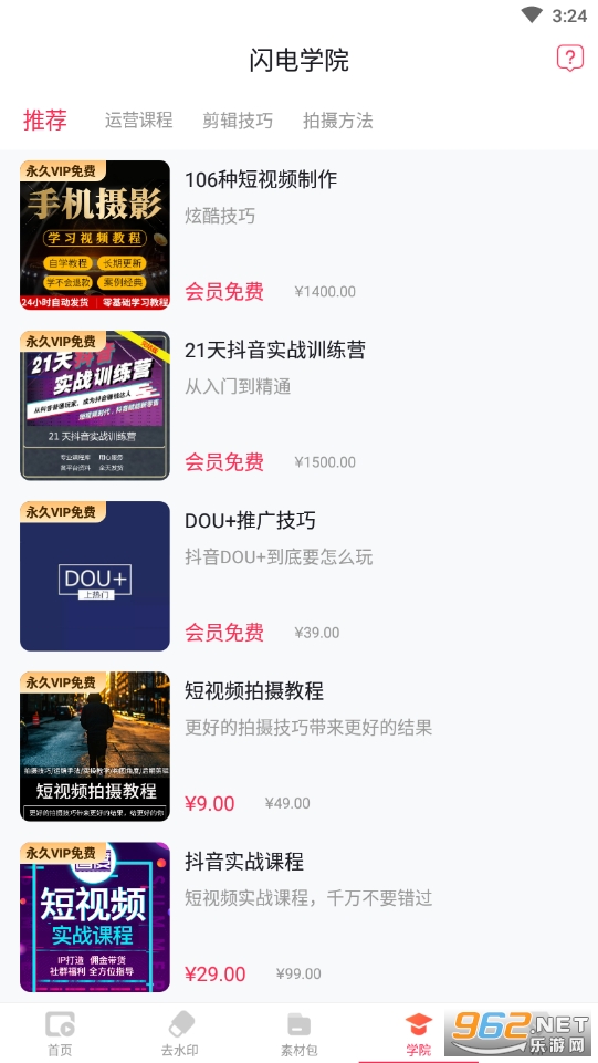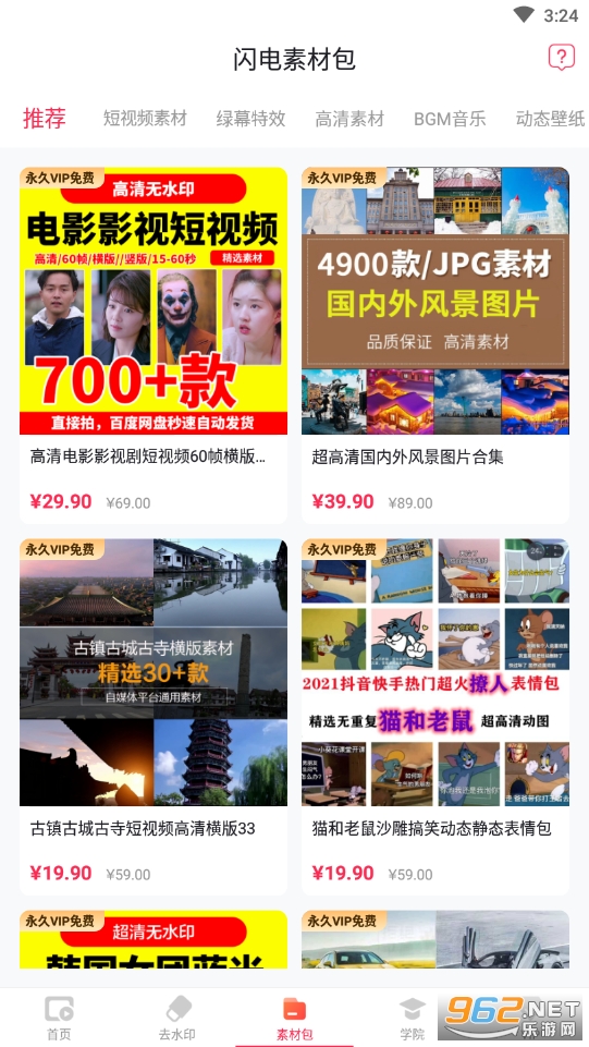 软件主打视频的开头绿幕素材为主,加入了视频提取去水印等功能,用户可以在这里找到各种满足你的素材哦,提供了各种短视频拍摄的思路以及剪辑技巧等课程哦,用户可以根据自己的需求进行购买