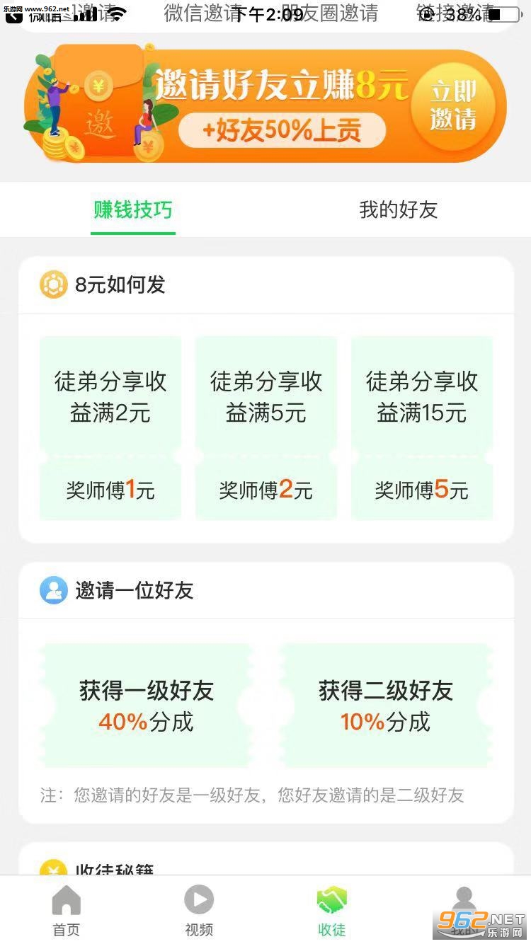 ③邀请好友8元师徒奖励+两级提成,一级40%提成,二级10%提成