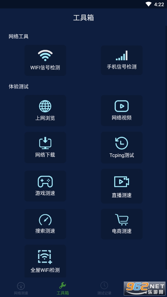 【工具箱】功能丰富,拥有WiFi信号检测、手机信号检测、全屋WiFi检测、上网浏览测速、游戏测速、Tcping测试等功能