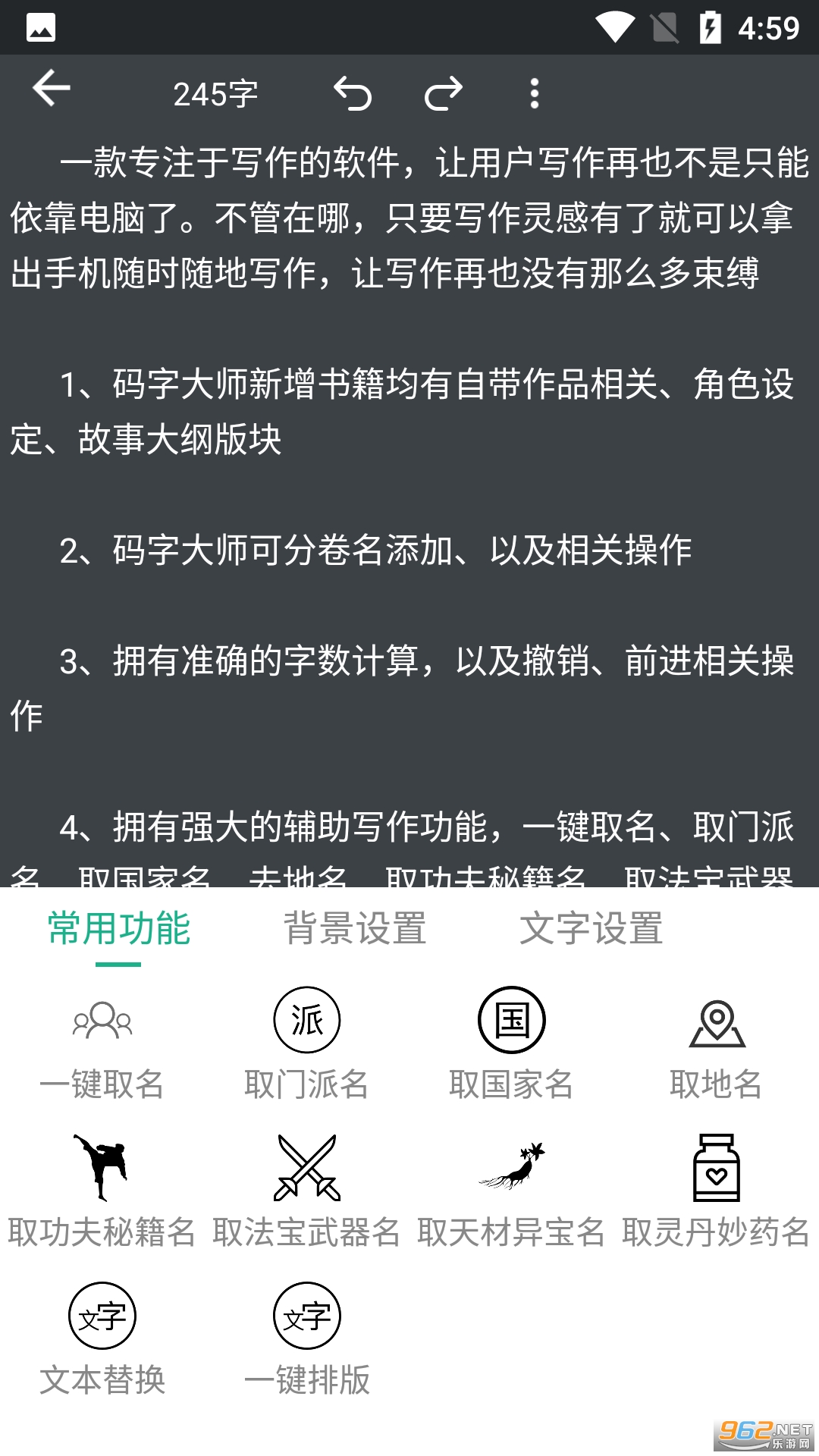 4、拥有强大的辅助写作功能,一键取名、取门派名、取国家名、去地名、取功夫秘籍名、取法宝武器名、取天材异宝名、取灵丹妙药名,以及批量关键字替换。