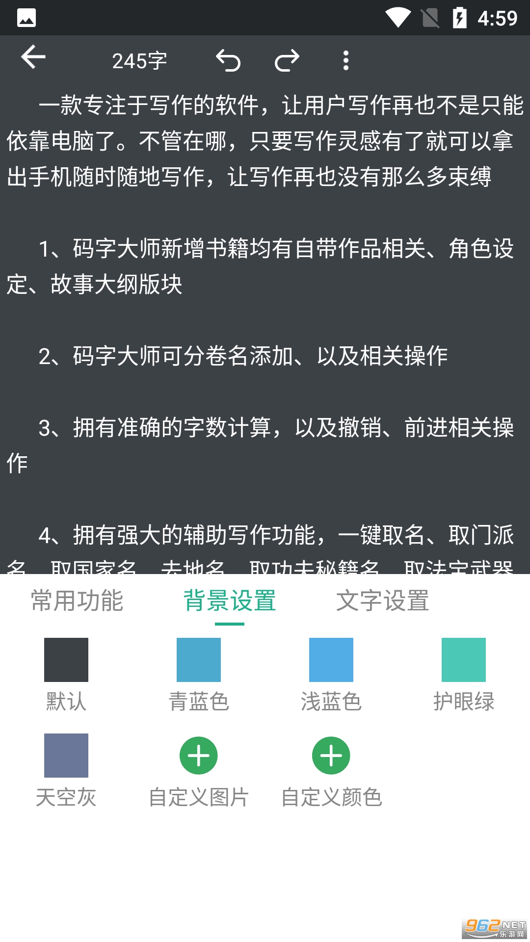 5、拥有强大的写作背景设置,除自带背景外,还可以自定义背景图片以及背景色。