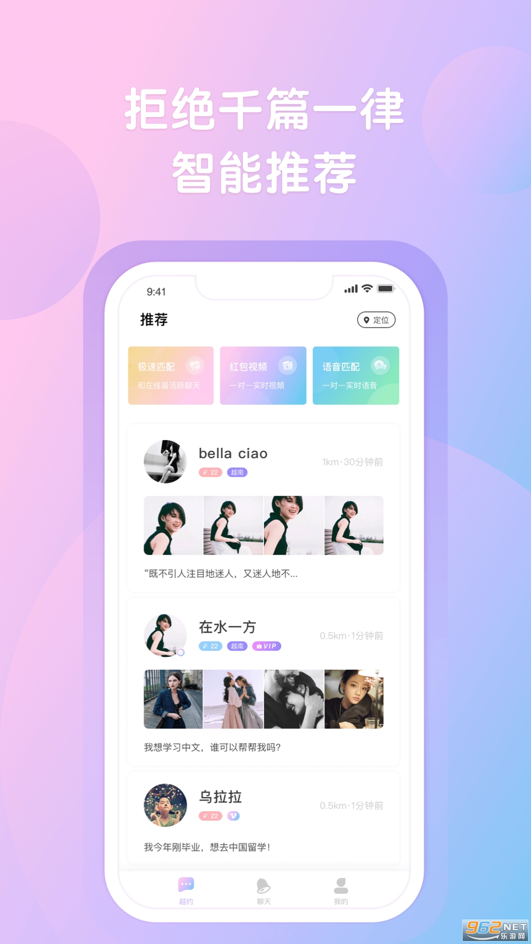 《越约app》是一款非常好用的美女聊天交友平台,任何时候你都不需要担心无聊的社交软件,更为智能快捷匹配模式让你轻松找到适合自己的异性,超多美女帅哥等你来撩,感兴趣欢迎来962下载吧!