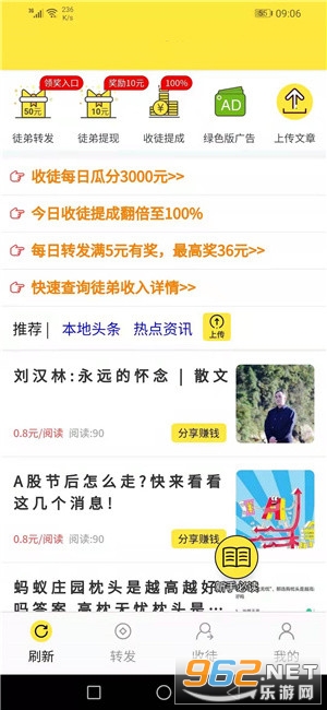 2、登陆成功后,点击“转发”频道任选一篇文章转发到,转发被点击阅读的次数越多,赚的也就越多