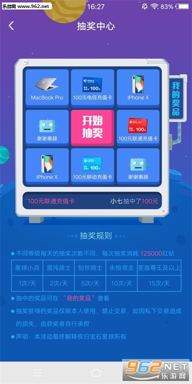 1. 蓝钻可用来提现每半小时产出一次, 红钻可用来抽奖每两小时产出一次。