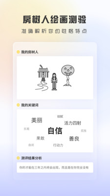 1、趣鸭独家绘画心理测评,用画笔描绘你的心理世界。简单的一房一树一人,向你展示一个不简单的心理测试世界。想在创造的愉悦中挖掘更深层次的自我吗?来趣鸭,开始你的房树人测试吧!
