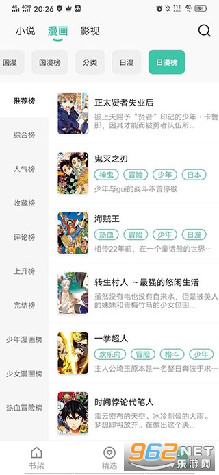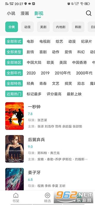 1、软件有三个书架(小说、漫画、影视),每种类型都有一个分类。