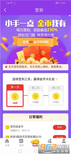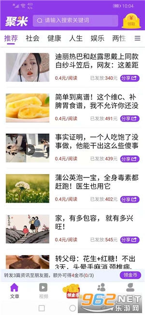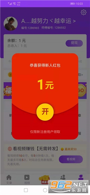 2、登录成功就有1元现金,然后点击“文章”或“视频”页面任选一篇文章转发到,被阅读就有钱