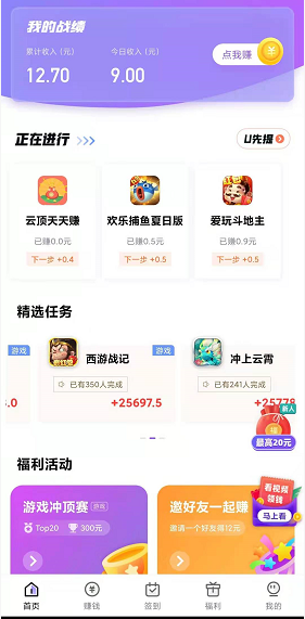 幸运蛙app是一款专注于游戏试玩赚钱的平台,拥有海量游戏供用户选择,随时随地想做就做,无任何门槛,完成新用户专属福袋最高可领20元,完成新人任务即可获得U提现,U提现就是满1元即可提现,最低20元起起提现,超多冲榜奖励等你来拿,邀请好友最高可以获得12元奖励!