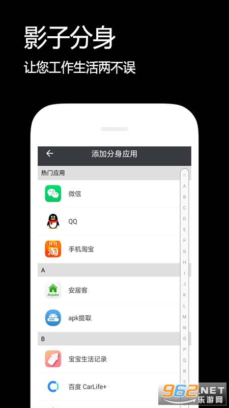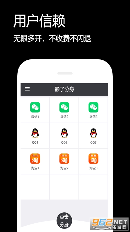 支持双开、分身、分身版、QQ双开、淘宝双开、快手双开、闲鱼双开、全民K歌双开、支付宝双开、拼多多双开等所有应用双开分身,双账号同时在线更欢乐!