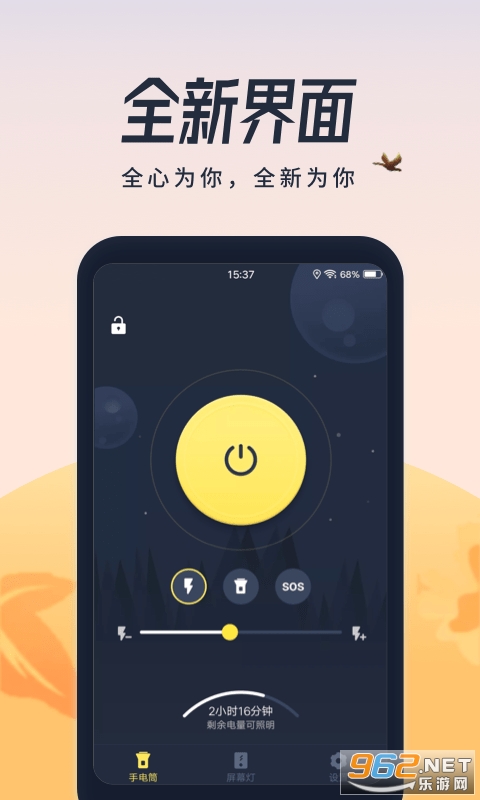 超亮闪光灯app是一款小工具应用,界面简洁无任何的广告,只有三栏,分别是手电筒以及一些简单设置和拥有的附加功能,附加功能里面的灯光选择比较的多,有闪着的灯光也有不闪动的,而且可以自由的调节灯光的亮度。