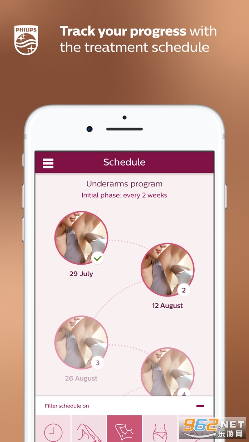 该应用可按照您喜爱的方式为您的每个身体部位制定一个个人照射计划,从而帮助您轻松使用 Lumea 设备获得理想脱毛效果,在每次照射期间它均会提供提示和建议并遵循正确的照射计划表。立即下载此应用,开启脱毛之旅!