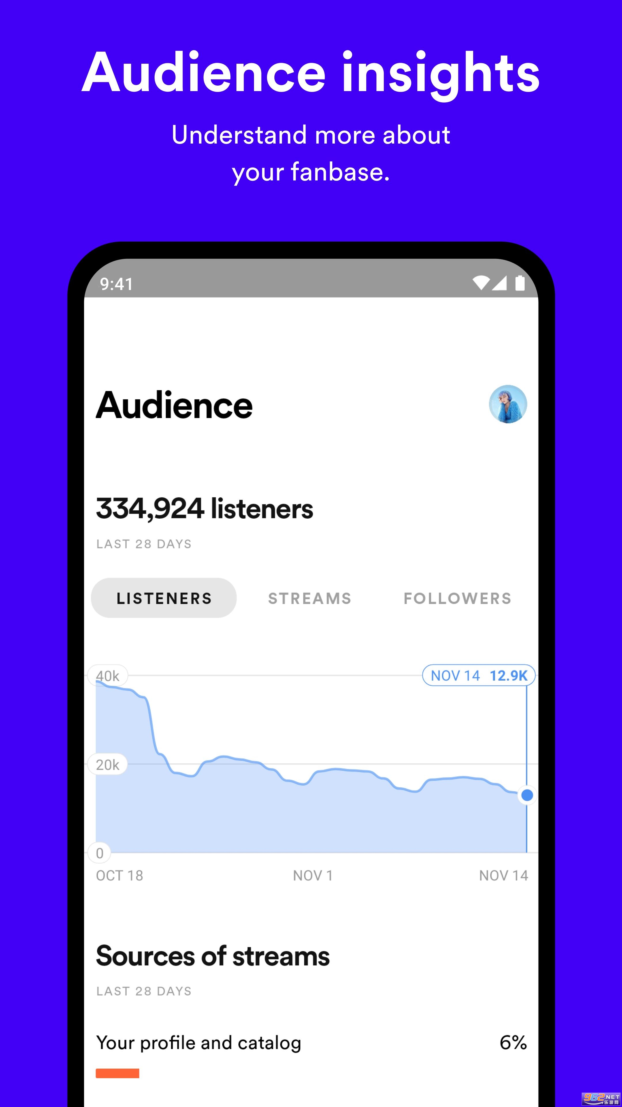 &8226;通过实时统计新发行版本,将您添加到播放列表中时的更新以及关注者里程碑来庆祝您的成功。
