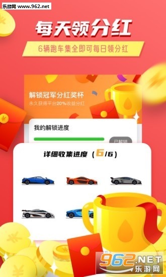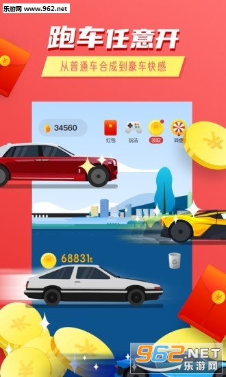 《一起开跑车红包版》是一款全新上线的手机赚钱平台,在这里用户通过玩赛车合成游戏来获得收益,两个相同等级的赛车就能合成更高的等级,还能通过比赛来获取红包,喜欢的朋友欢迎来962下载吧!