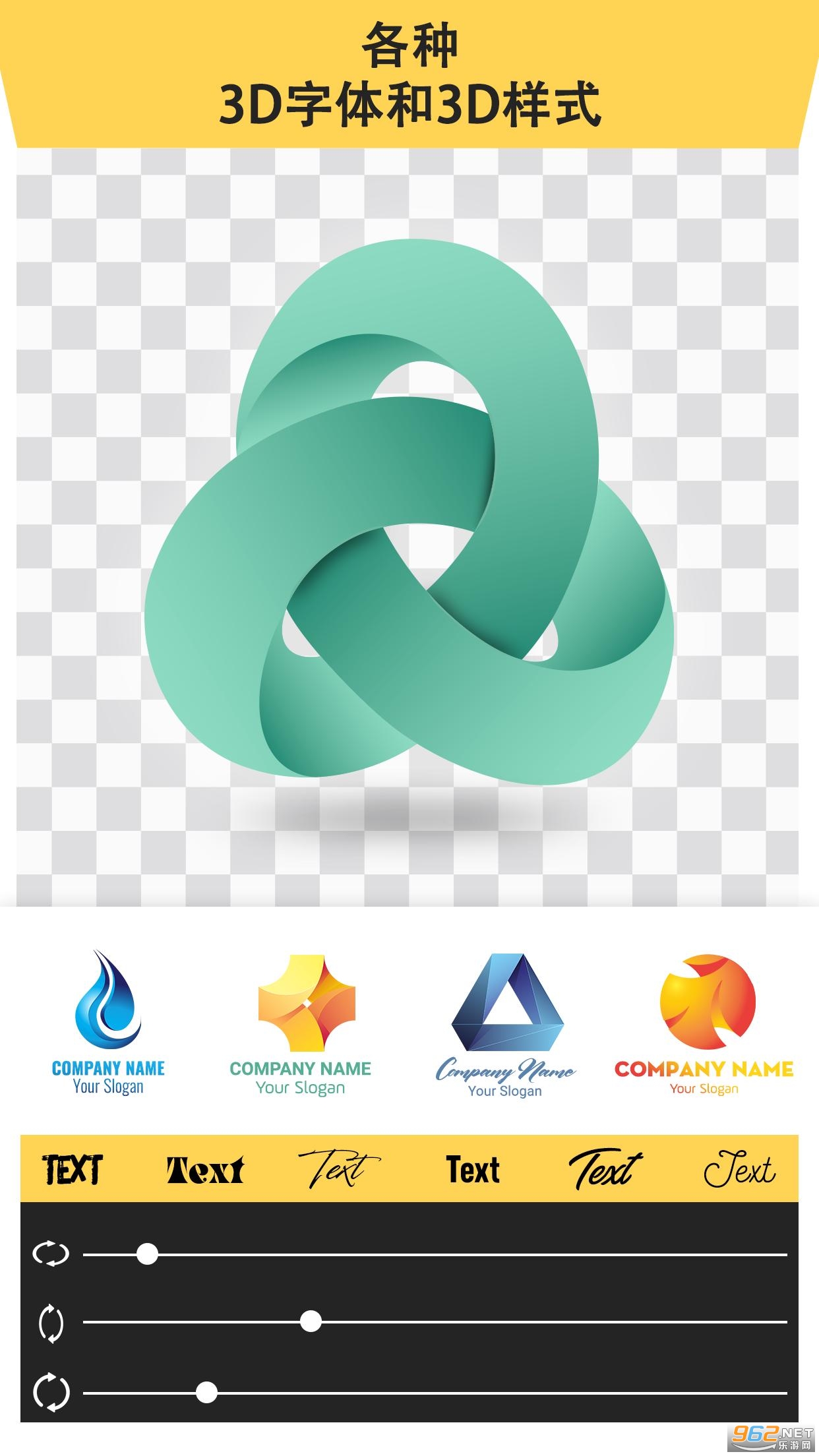 3D Logo Maker:创建3D徽标和Design Free还提供专业的照片编辑和文本编辑工具,如:3D旋转,字体,翻转,颜色,旋转,曲线,色调,调整大小等等,您需要创建美丽的原始3D标志。