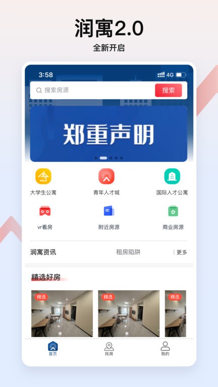 润寓智慧租赁平台简称润寓App,是为了节约承租人宝贵的时间,提高业务办理效率,充分实现“网络多跑腿、人才少跑腿”为理念,制作的一款集在线申请、VR看房、在线签约、在线支付、在线报修、生活服务等功能的线上办理全流程业务的智慧平台。