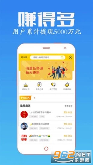1、抢任务:平均每天悬赏主会发出任务,手指点点赏金到手。