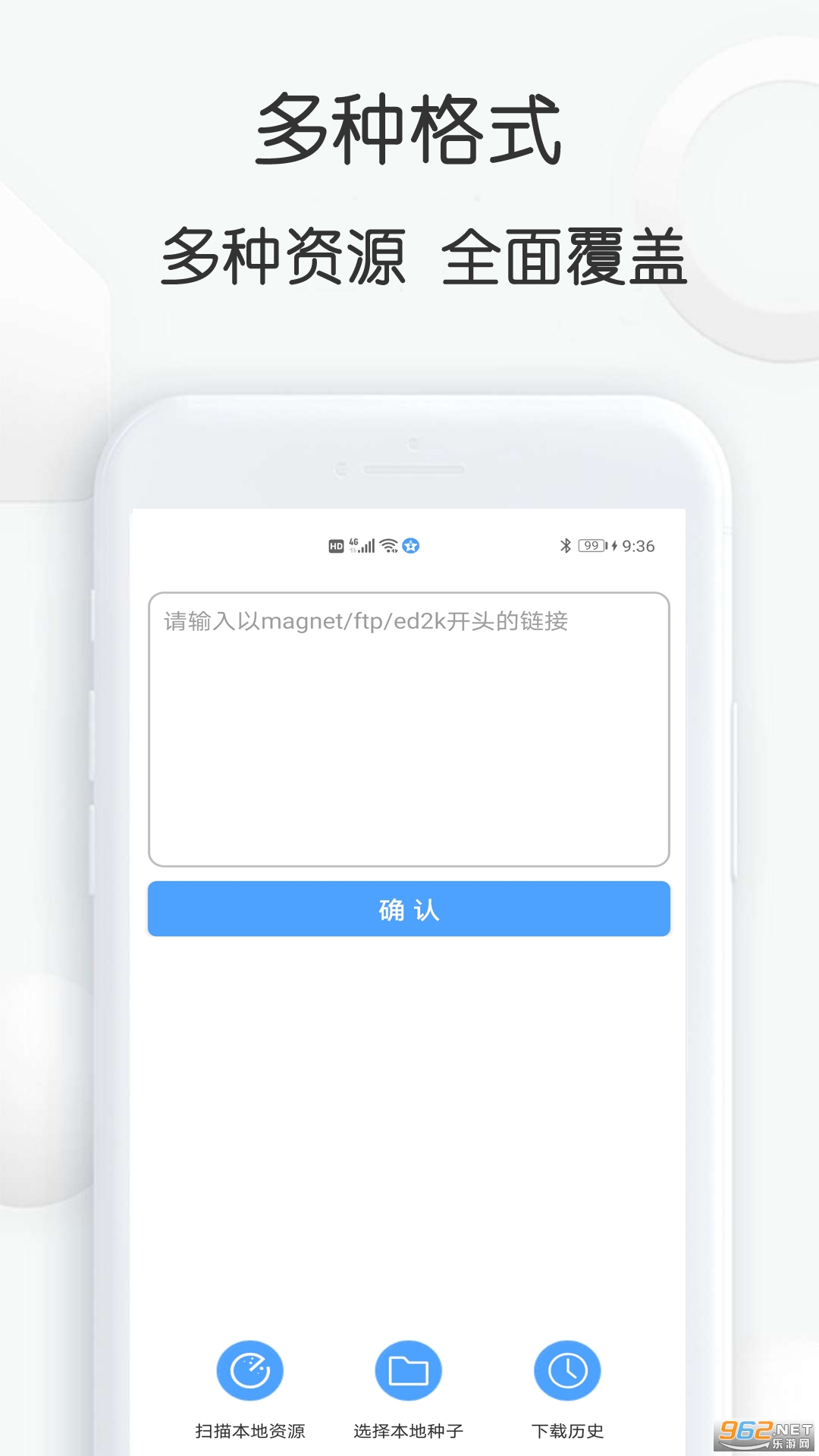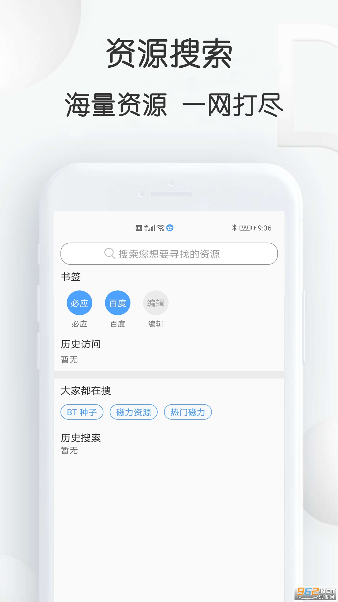 【资源搜索】支持电影、音乐、文档、图片、动漫等文件资源的搜索,不管是网络链接、bt种子搜索、磁力搜索,一键即可开启搜索,同时可以收藏至本地,资源无忧。