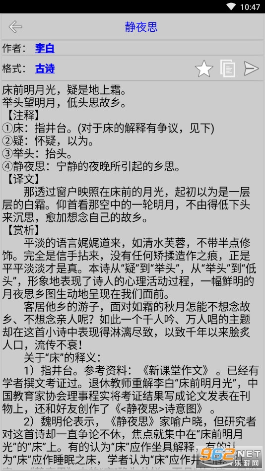 非常不错的诗歌学习和欣赏的软件,有着海量的诗歌资源,国内外的都有,各个时代的也有,朋友们可以直接在软件中搜索自己想要的诗词,非常方便,界面也很简洁,喜欢的朋友可以下载试试。
