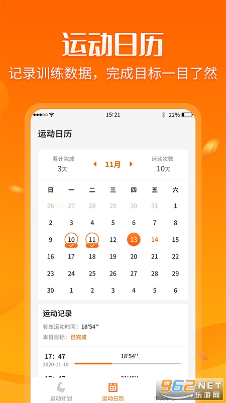 完成当日运动目标,即在当日日期上显示打卡成功标识,运动数据、记录体重,运动时间,健康状况等全方位数据,看到自己最完美的蜕变记录训练数据,完成当日运动目标,即在当日日期上显示打卡成功标识,运动数据一目了然,见证你每天的进步