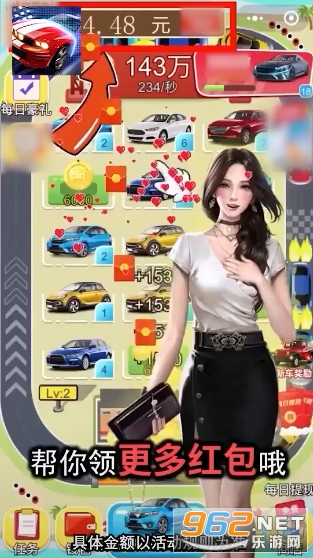《车神驾临红包》是一款赛车合并赚红包游戏,游戏中玩家需要通过合并的方式来赚红包,提升小车的等级,只要解锁新小车就可以获得红包,小车的等级越高,产生的金币就越多,然后你就有足够的金币去购买小车合并了,这样你才能赚到更多的红包。