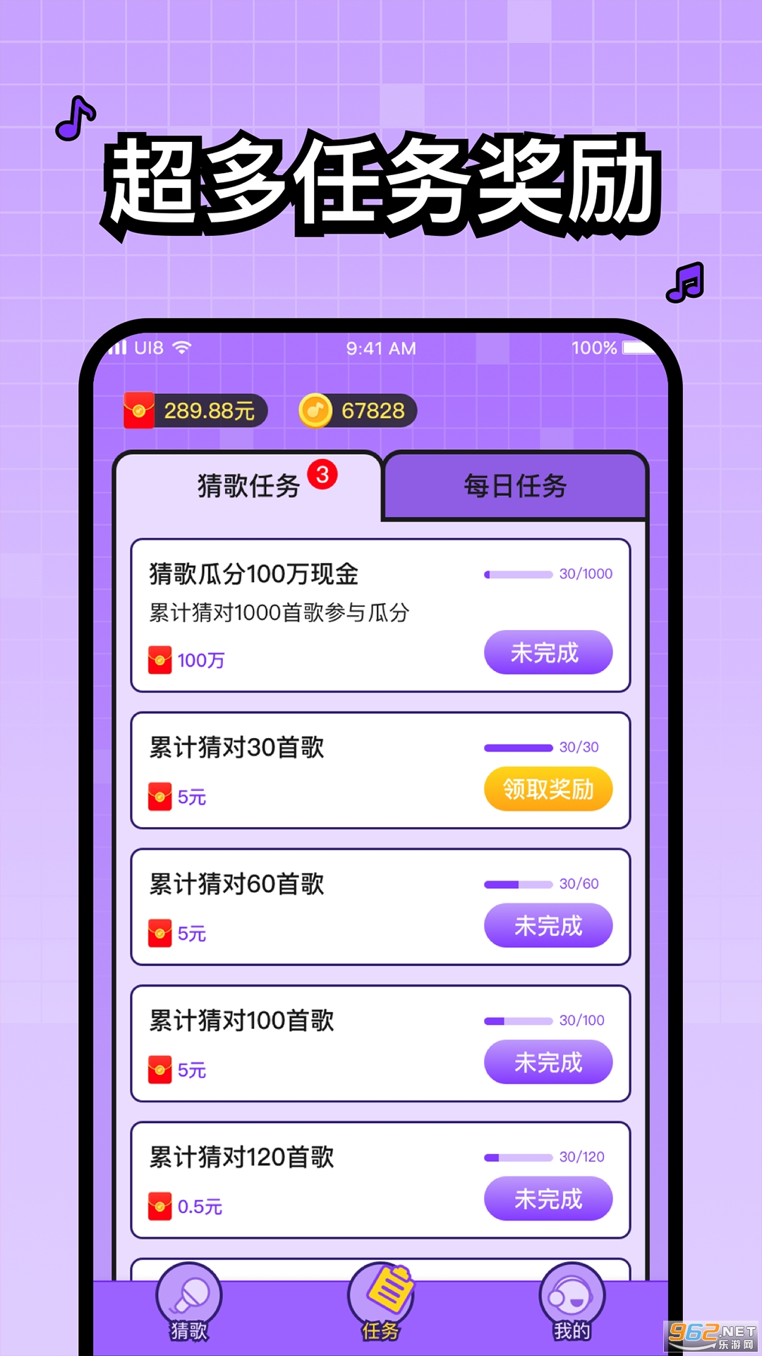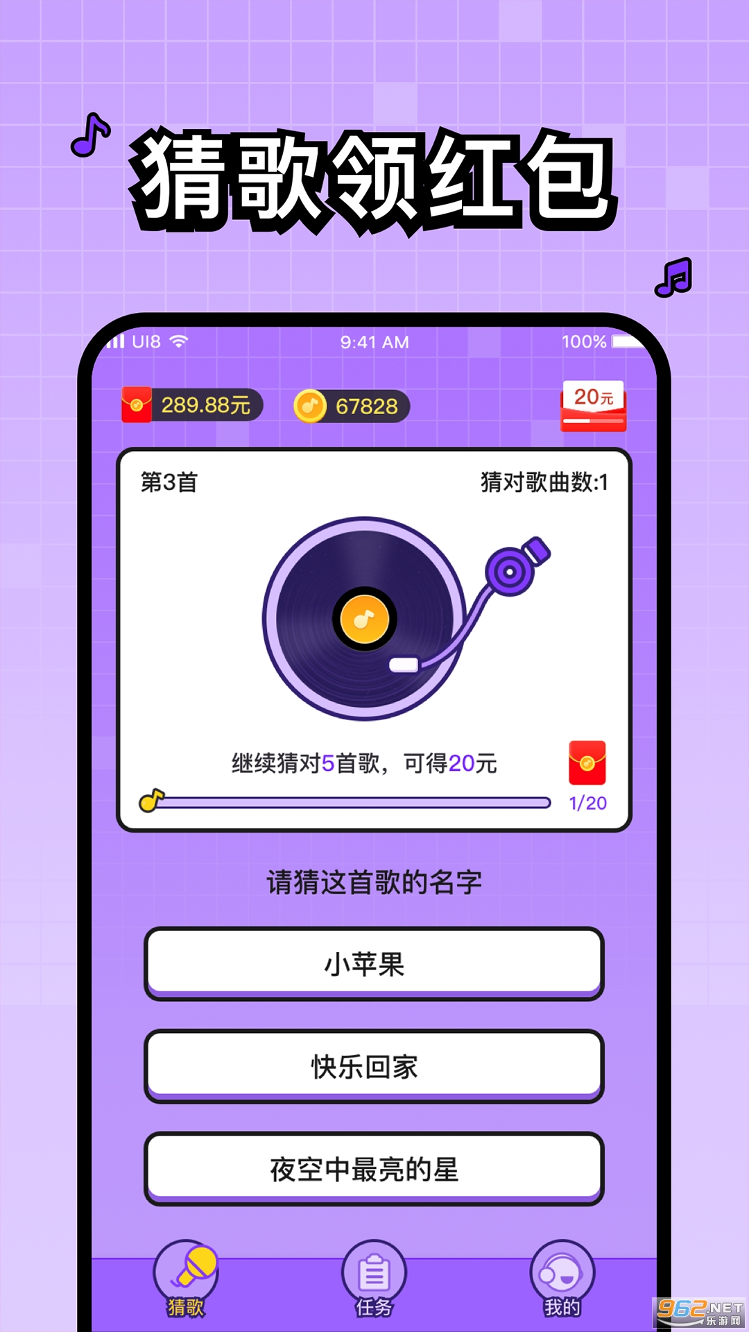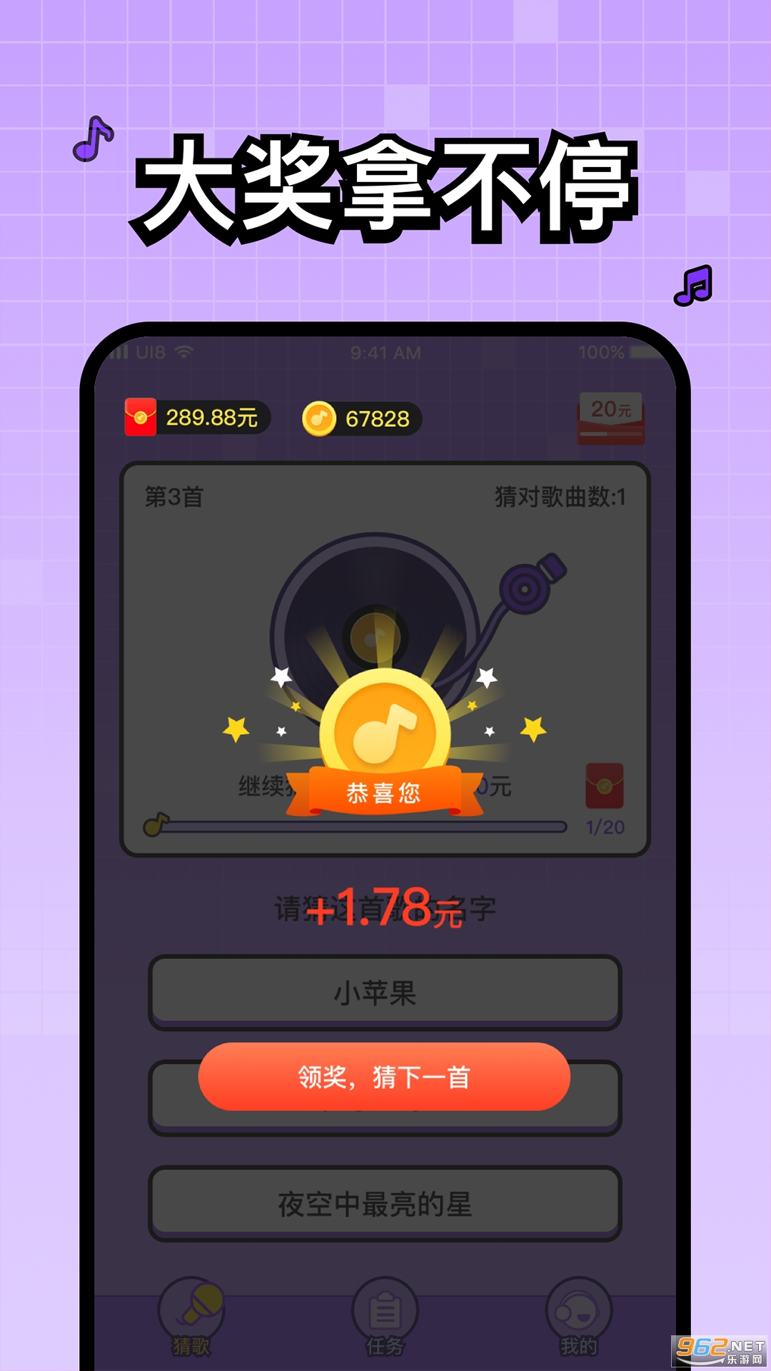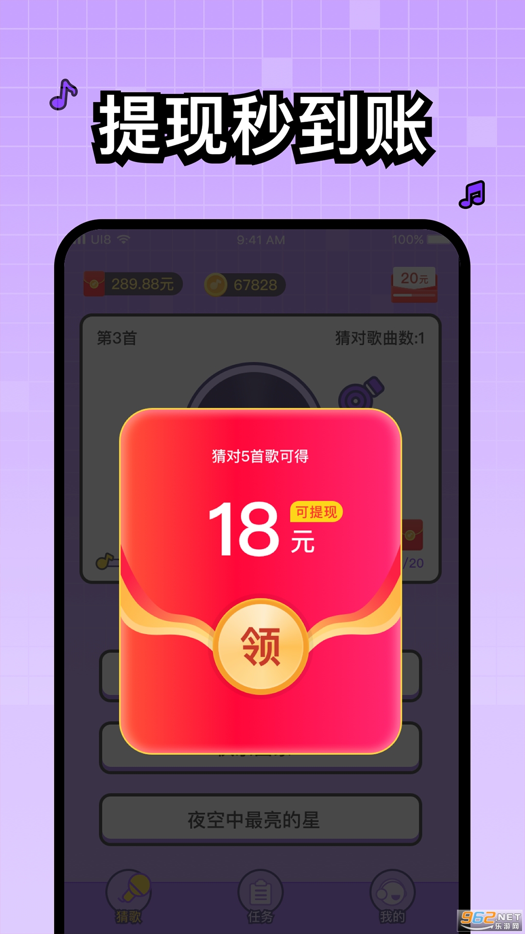 《头号歌迷赚钱app》是一款趣味猜歌赚钱游戏,游戏的画面可爱活泼,曲库超大,各种歌曲都有,根据你听到的音乐来猜出歌名,不要辜负你犯人曲库之名,只要猜对名字就能得到红包奖励,猜对的越多,得到的红包就越多,急速提现,秒到账,快来试试吧。