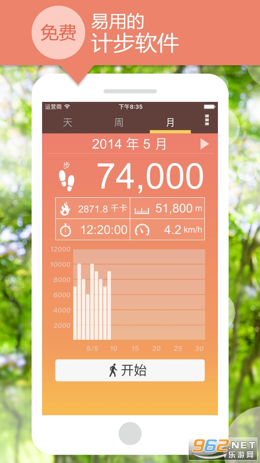 掌上计步app记录并显示您已走的步数,连同您已燃烧的卡路里数量、行走距离、行走时间和每小时速度。 它使用方便。一旦您按下启动按钮,您所要做的就是像平常一样拿着您的智能手机走路。