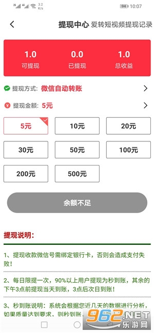 3、爱转短视频首次收入满5元就能提现到零钱,后续满10元可申请,一个工作日内快速到账