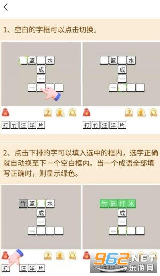 3、丰富的游戏模式,根据已有的词汇选择出正确的汉字,完成成语的组合。